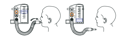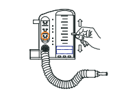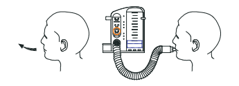3. Inspira lentamente e profondamente con il dispositivo in posizione verticale, mantenendo la sfera indicatrice di flusso nella posizione della faccina sorridente. Inspira il più profondamente possibile. Quando non riesci più a inspirare, trattieni il respiro per qualche secondo e controlla a che altezza è arrivato il pistone. Cerca di raggiungere il livello target prescritto. Ripeti la procedura per il numero di volte prescritto. Registra la tua curva di progresso sul foglio di registrazione dell'utente.