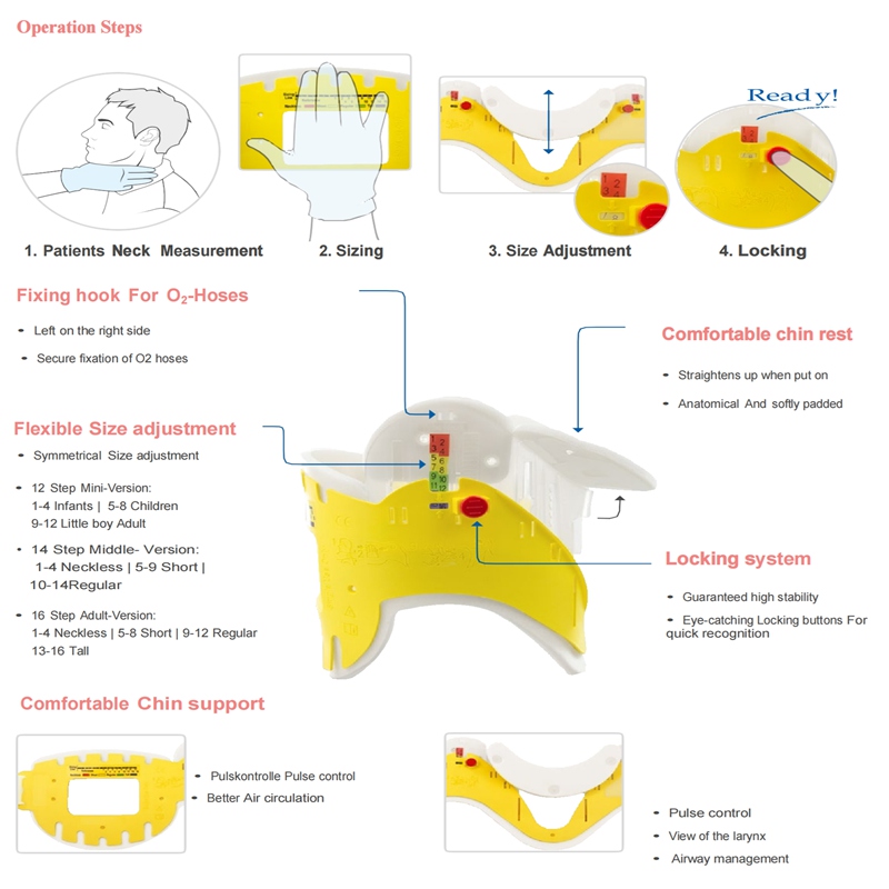 Questo collare cervicale di soccorso è un dispositivo di immobilizzazione rigido integrato che mantiene l'allineamento neutro della colonna cervicale, limita i movimenti laterali, di flessione ed estensione durante il trasporto e la movimentazione e contribuisce a prevenire lesioni secondarie.
